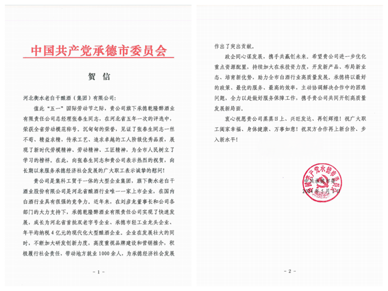 河北衡水老白干釀酒集團(tuán)收到一封來自承德市委的賀信,賀信主要內(nèi)容是對(duì)河北衡水老白干釀酒集團(tuán)子公司承德乾隆醉酒業(yè)(板城酒業(yè))黨委書記、總經(jīng)理張春生榮獲“全省勞動(dòng)模范”稱號(hào)表示祝賀。祝賀信中講到:“張春生同志一絲不茍、精益求精,傳承工藝、追求卓越的工人階級(jí)優(yōu)秀品質(zhì),展現(xiàn)了新時(shí)代勞模精神、勞動(dòng)精神、工匠精神,為全市人民樹立了榜樣,近年來,企業(yè)在發(fā)展壯大的同時(shí),不斷加大研發(fā)創(chuàng)新力度,高度重視品牌建設(shè)和營(yíng)銷推介,積極履行社會(huì)責(zé)任,帶動(dòng)地方就業(yè)1000余人,為承德經(jīng)濟(jì)社會(huì)發(fā)展作出了突出貢獻(xiàn)。”張春生作為制造業(yè)(工業(yè)領(lǐng)域)的翹楚,先后獲省“三三三人才工程”人選、河北省企業(yè)家協(xié)會(huì)先進(jìn)工作者、河北省食品行業(yè)年度人物、中國(guó)商業(yè)聯(lián)合會(huì)科學(xué)技術(shù)獎(jiǎng)、全國(guó)商業(yè)科技進(jìn)步獎(jiǎng)-特等獎(jiǎng)、2020年與2022年度分別榮獲河北省優(yōu)秀民營(yíng)企業(yè)家等多項(xiàng)榮譽(yù)。