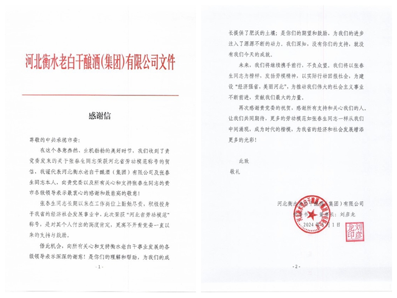 河北老白干釀酒集團(tuán)在感謝信中寫到:“張春生同志長(zhǎng)期以來在工作崗位上勤勉盡責(zé),積極投身于我省的經(jīng)濟(jì)社會(huì)發(fā)展事業(yè)之中,此次榮獲河北省勞動(dòng)模范,是對(duì)其個(gè)人付出的高度肯定,更離不開承德市黨委一直以來的支持與鼓勵(lì)。我們將以張春生同志為榜樣,發(fā)揚(yáng)勞模精神,以實(shí)際行動(dòng)回報(bào)社會(huì),為建設(shè)經(jīng)濟(jì)強(qiáng)省,美麗河北,貢獻(xiàn)我們最大的力量”。