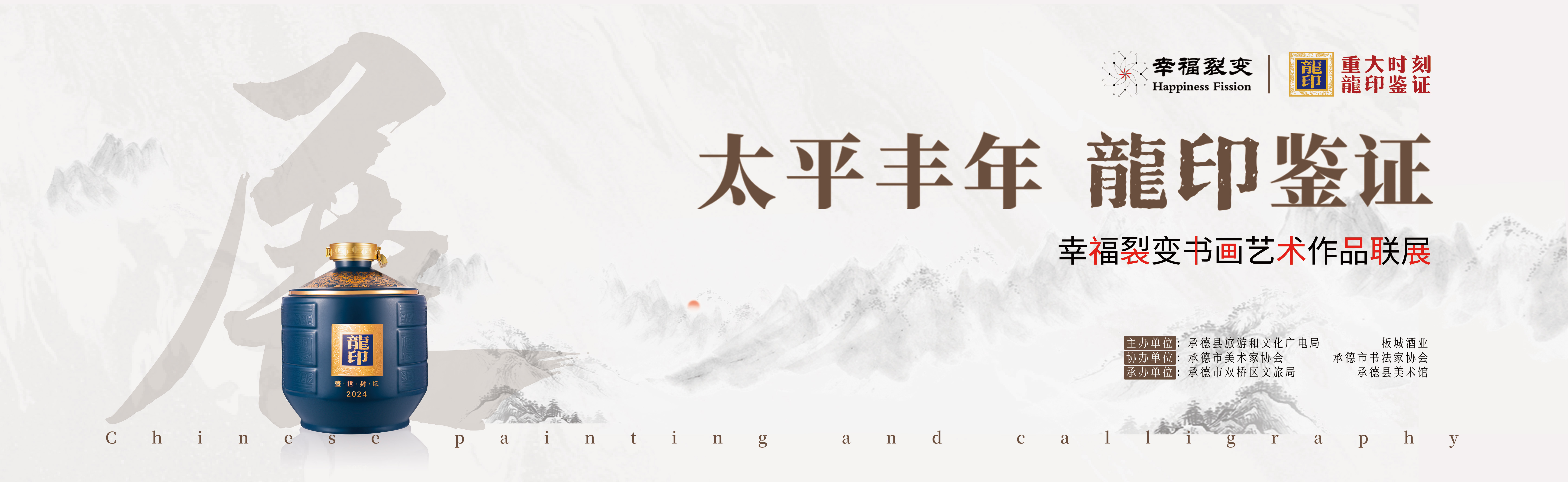 太平豐年,龍印鑒證;9月19日,由承德縣旅游和文化廣電局、板城酒業(yè)主辦;承德市美術(shù)家協(xié)會(huì)、承德市書(shū)法家協(xié)會(huì)協(xié)辦;承德市雙橋區(qū)旅游和文化局、承德縣文化館承辦的“太平豐年龍印鑒證——幸福裂變書(shū)畫(huà)藝術(shù)作品聯(lián)展”活動(dòng)盛大開(kāi)幕。