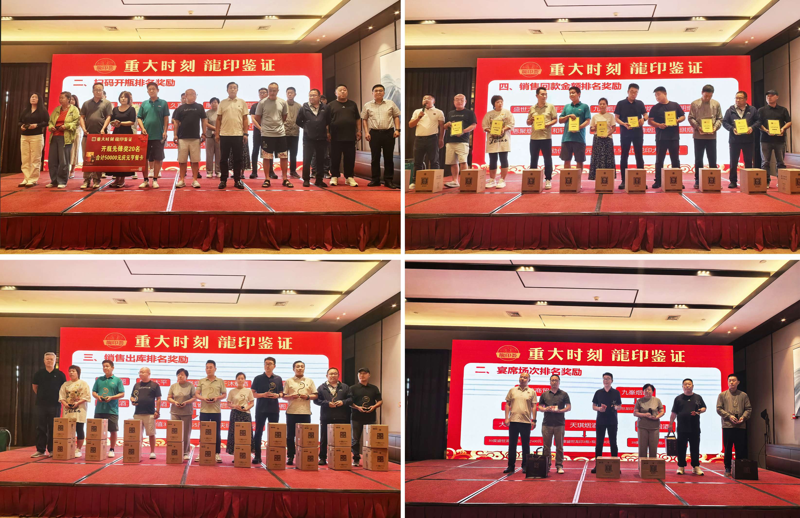 為感謝經(jīng)銷商伙伴長(zhǎng)久以來的支持和貢獻(xiàn),活動(dòng)現(xiàn)場(chǎng)還設(shè)置了頒發(fā)環(huán)節(jié),石家莊戰(zhàn)區(qū)龍印部銷售總監(jiān)孫坤申、恒潤(rùn)德酒類品牌管理有限公司董事長(zhǎng)潘雁群、石家莊戰(zhàn)區(qū)龍印部區(qū)域經(jīng)理徐立國(guó)、恒潤(rùn)德酒類品牌管理有限公司龍印事業(yè)部經(jīng)理張?jiān)謩e為開瓶率、履約、回款、宴席做出突出貢獻(xiàn)的終端客戶進(jìn)行頒獎(jiǎng)。