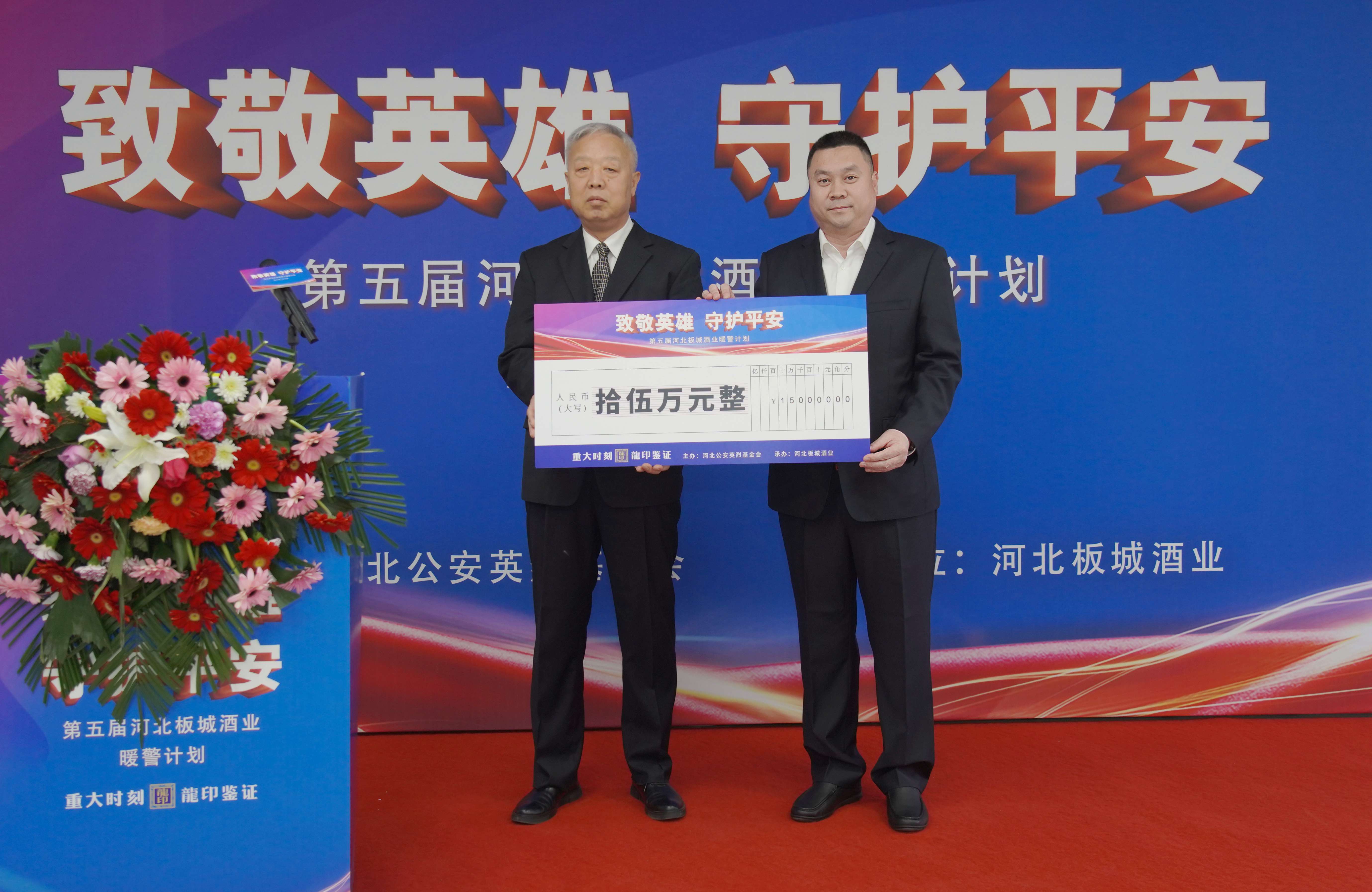 在捐贈儀式上,板城酒業(yè)黨委書記、總經(jīng)理賀延昭向河北省公安英烈基金會捐贈15萬元暖警公益基金。